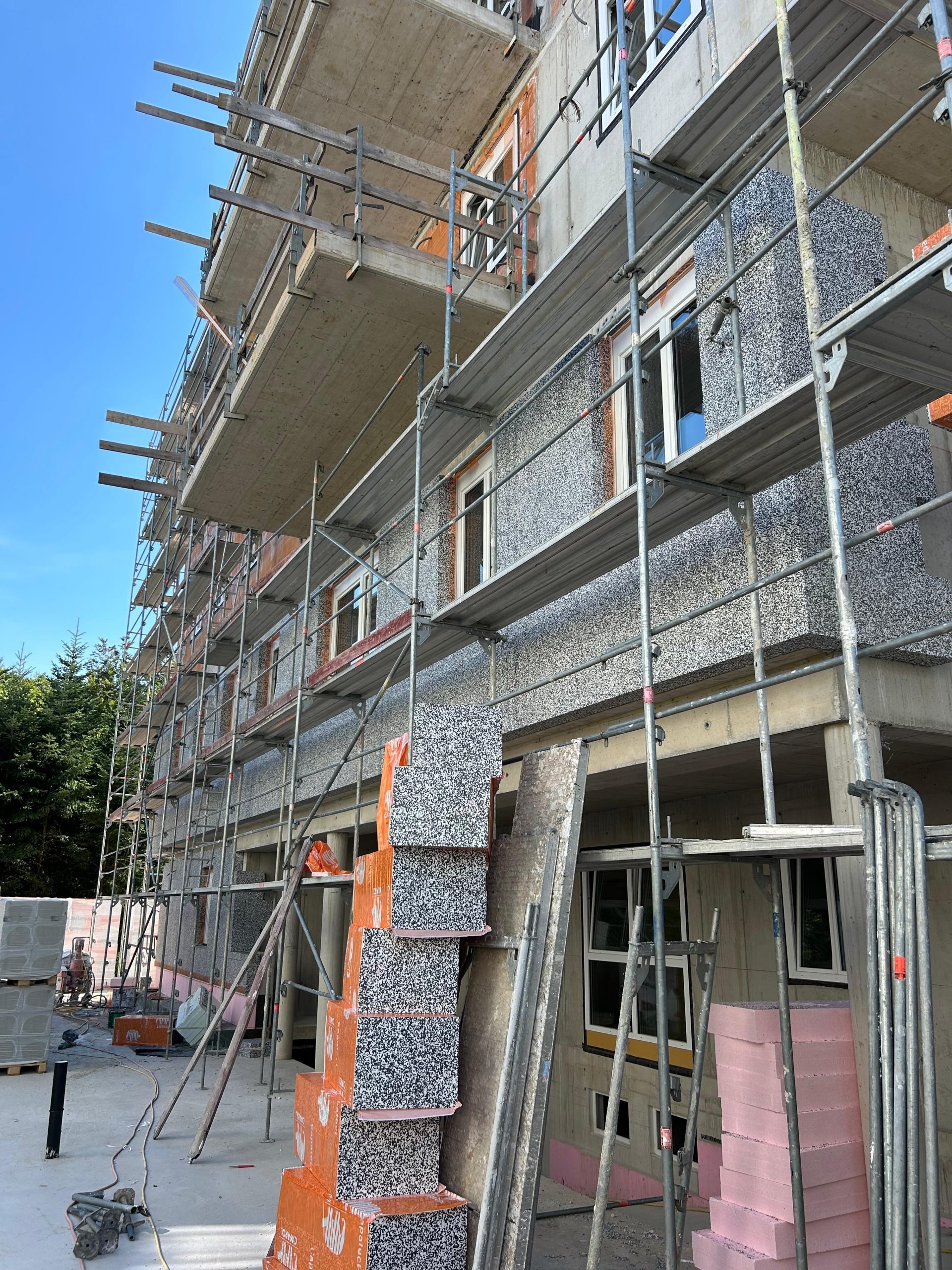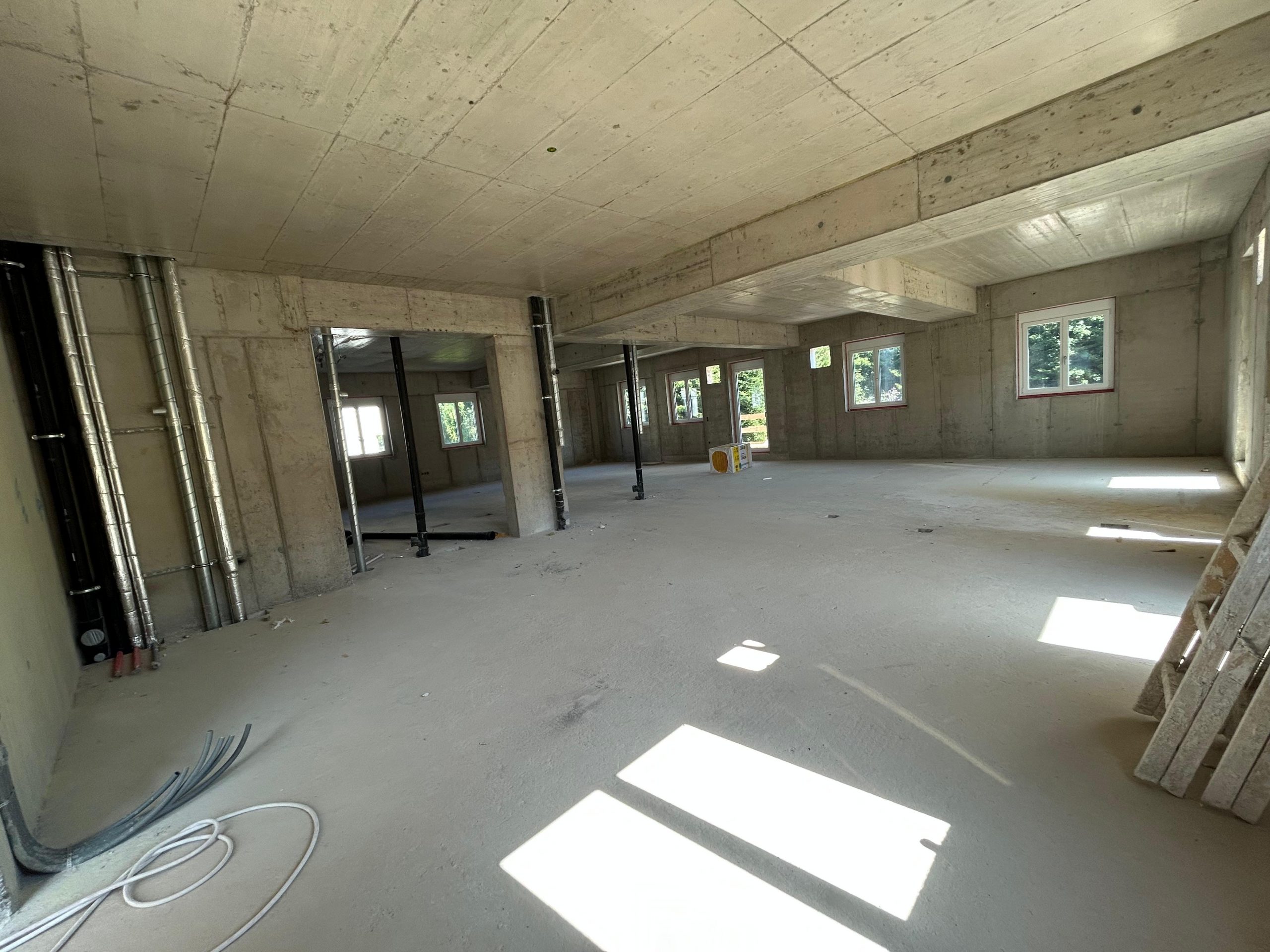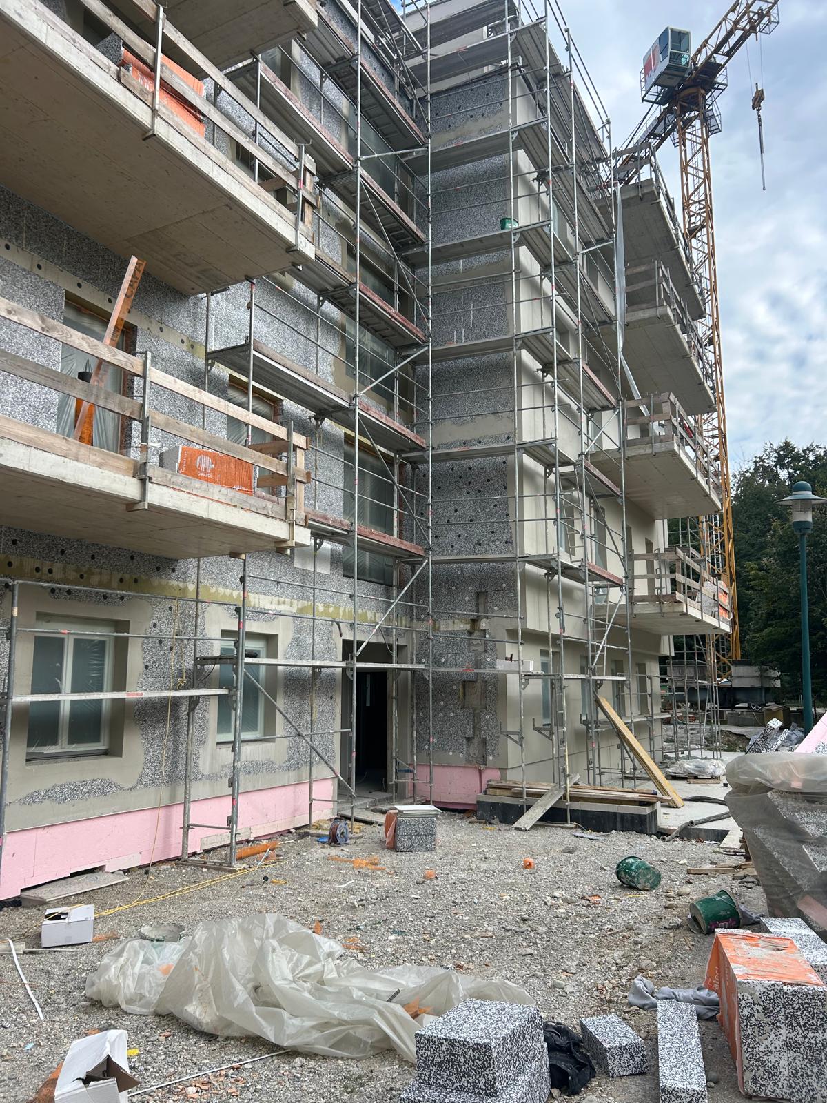 Die Arbeiten schreiten zügig voran: Die Spenglerarbeiten sind bereits weit fortgeschritten, parallel dazu sind auch die Innenputzer und Trockenbauer fleißig am Werk. Zusätzlich laufen die