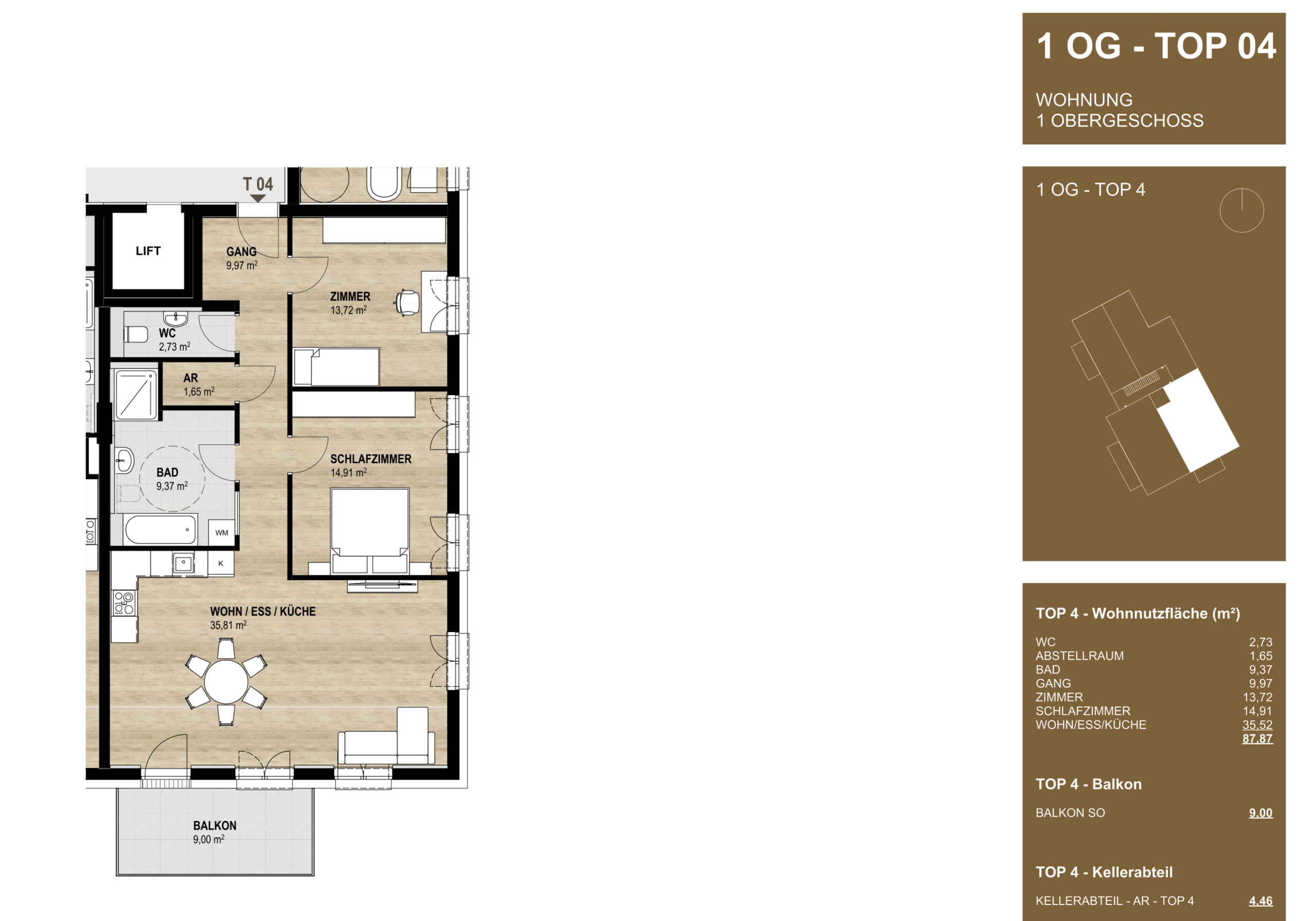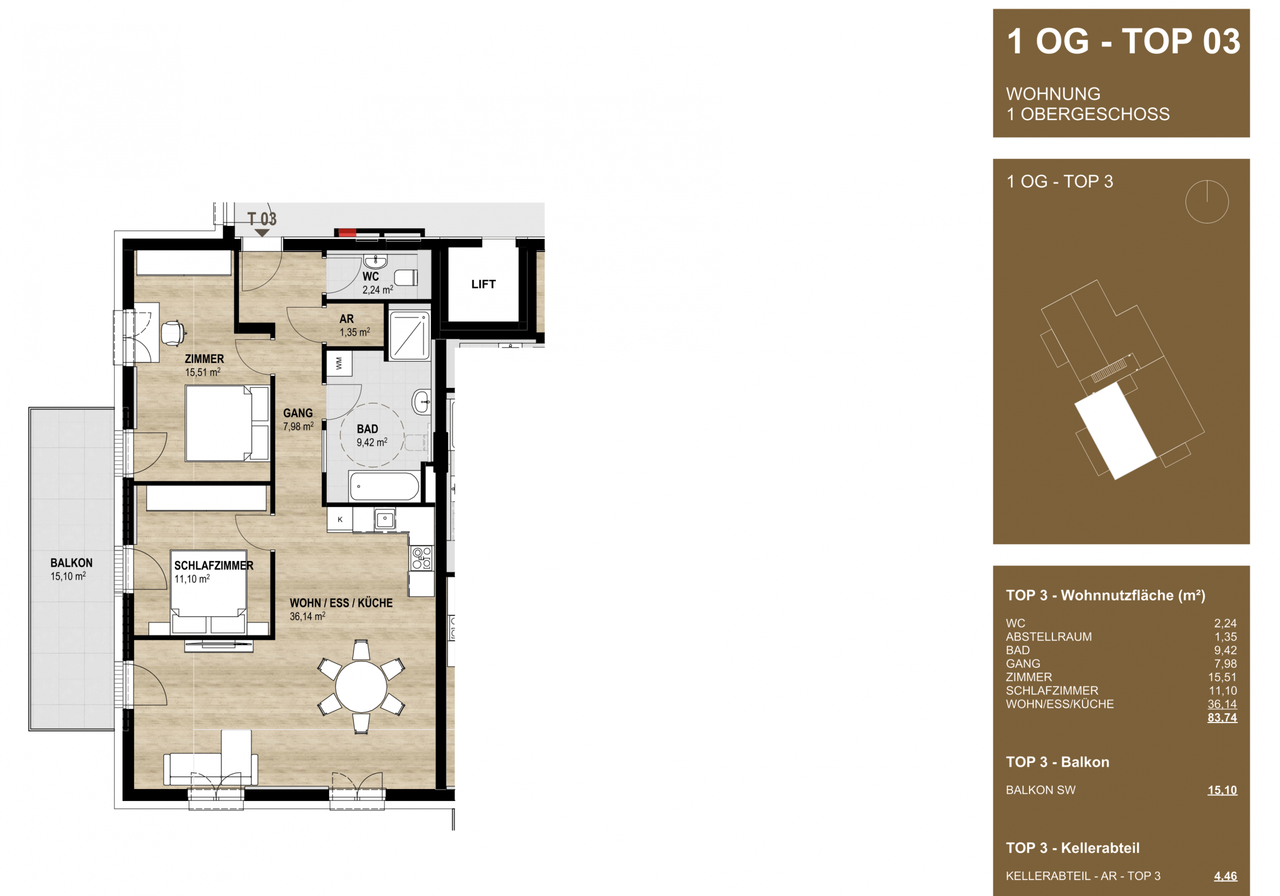 | Top 03 | 84 m² | 15 m² | 1. Stock | 3 Zimmer | 417.900 € |