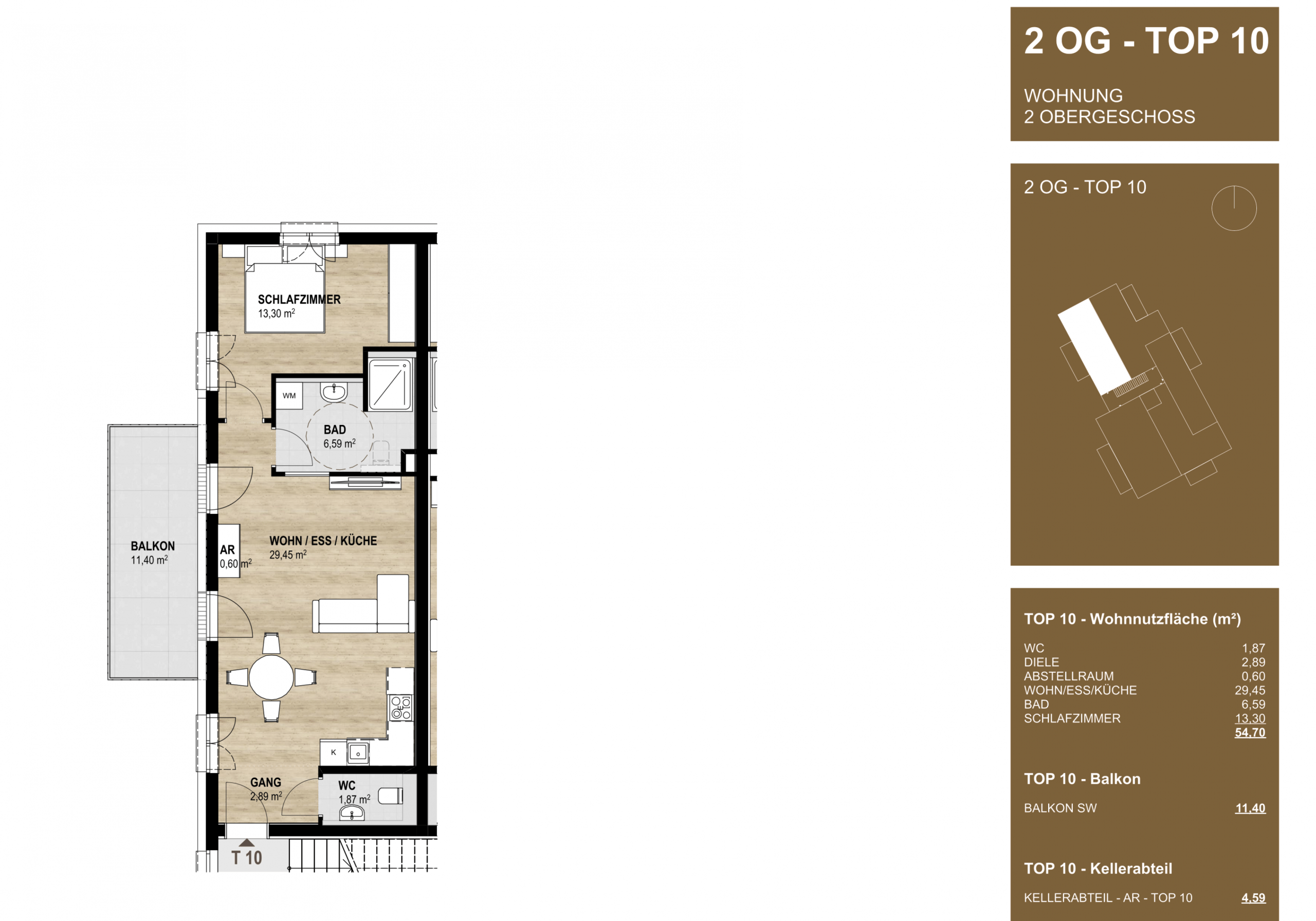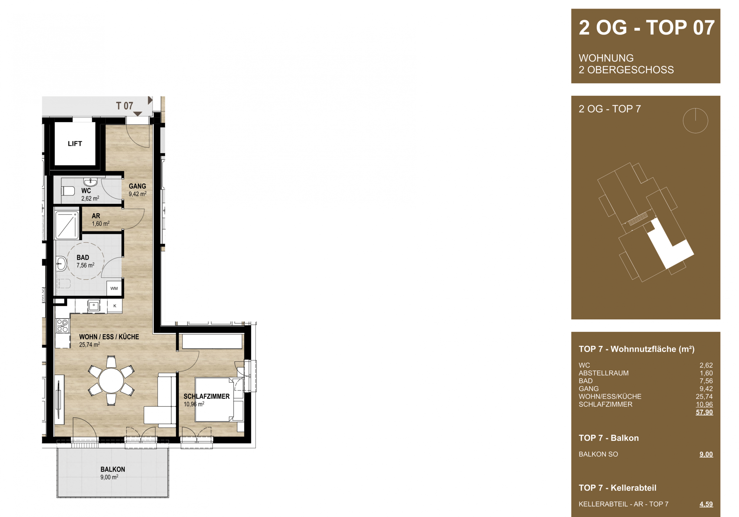 | Top 07 | 58 m² | 9 m² | 2. Stock | 2 Zimmer | 295.900 € |