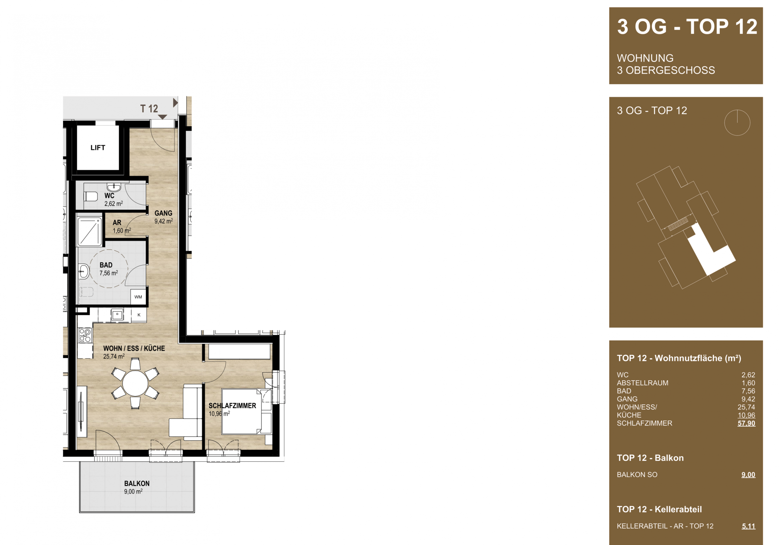 | Top 12 | 58 m² | 9 m² | 3. Stock | 2 Zimmer | 295.900 € |