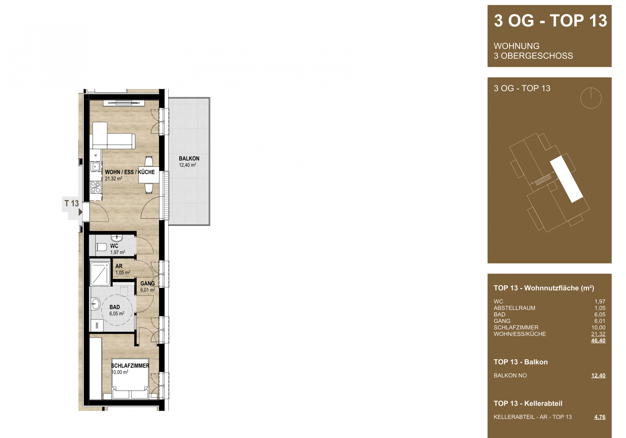 | Top 13 | 47 m² | 12 m² | 3. Stock | 2 Zimmer | 239.900 € |