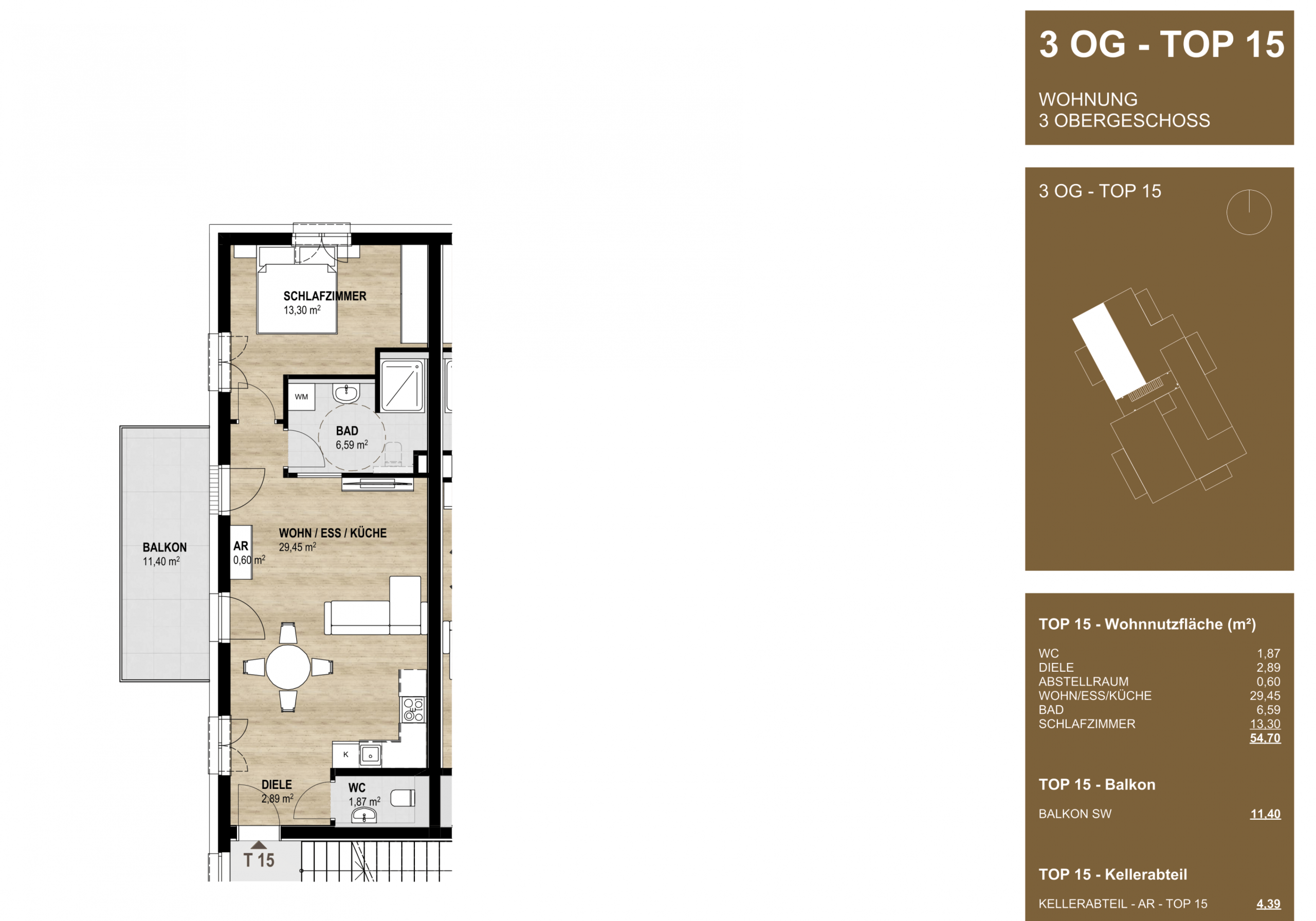 | Top 15 | 55 m² | 11 m² | 3. Stock | 2 Zimmer | 264.900 € |